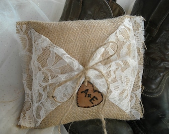 A beige fabric heart-shaped pillow with lace trim and a bow tied at the top is placed on a white surface. The pillow has a heart-shaped cutout with the initials 'A & E' embroidered in the center. The lace trim is white, and the bow is tied with a brown string. In the background, there are two pairs of brown boots, one on each side of the pillow. | Burlap and Lace Personalized Ring Bearer Pillow-Wedding Pillow - Personalized Wedding Pillow- Country Wedding - Rustic Wedding - Ring Bearer | d025ca5df1d3d2f4ed094e2d265c1e886c09032f3a46e1561d79a5a82ee3c5de | 000720962046 | 0 | 0 | 68 | 20 | 0 | 0 | |