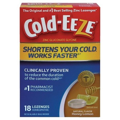 A red and blue box of Cold-Eeze lozenges with a yellow and green label. The box is titled 'Cold-Eeze' and has the tagline 'Shortens Your Cold Works Faster'. The label features a honey dipper and a lemon, with the phrase 'Clinically Proven to Reduce the Duration of the Common Cold' and '1st Pharmacist Recommended'. The box is filled with 18 lozenges. | Mylan will have access to all products under the Cold-Eeze brand, which include cough drops, gummines and throat lozenges. | cf62035cdb83a097c5f1c1e9f2c2b05d41ada275f70fcaba7343f3690b3d49a4 | 000720962089 | 0 | 0 | 61 | 19 | 0 | 0 | |