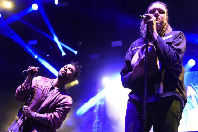 A concert scene with two male performers on stage. The performer on the left is wearing a brown jacket and is holding a microphone. He has short hair and is looking towards the performer on the right. The performer on the right is wearing a black jacket and is also holding a microphone. He has long hair and is looking towards the audience. Both performers are standing in front of a stage with bright lights and a crowd in the background. | Arcade Fire's Win Butler and Miguel Covered Drake's 'Hotline | c9a13605b92e10f6fc44de9c699888228f677a2898df7d061a3b91b945ec93d1 | 000720962069 | 0 | 0 | 81 | 9 | 0 | 0 | |