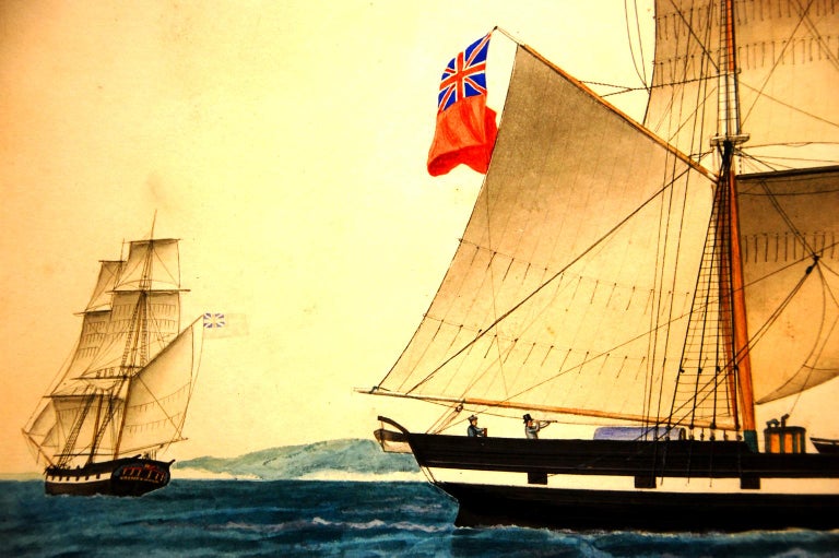 A detailed illustration of a large sailing ship with multiple sails unfurled, flying a red and white flag at the top of the mainmast. The ship is depicted on a calm sea with a smaller ship in the background to the left. The illustration has a vintage feel, with a sepia-toned color palette and a focus on the intricate details of the ship's rigging and sails. | Danish 19th Century Watercolor Portrait of the Brig | 72845ea2c1bbb43643b08854a27b6dacb1fdded56eebb66e33d3e2cacd8fd2c0 | 000720962486 | 0 | 0 | 66 | 8 | 0 | 0 | |