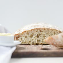 A loaf of bread with a slice cut off is placed on a wooden cutting board. The slice of bread is next to a small white bowl filled with butter. The scene is set against a plain white background. | Homemade No-Knead Ciabatta Bread l SimplyScratch.com | 66e6498853821ce0db005bd14d3f23c2488013646a18337ac350e1084c421e23 | 000720962576 | 0 | 0 | 39 | 6 | 0 | 0 | |