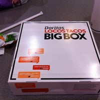A closed box with the words 'Doritos Locos Tacos Big Box' written on it. The box is white with a black border and has several orange and white stickers on it. There is a plastic straw and a crumpled up piece of paper on the table next to the box. | Photo taken at Taco Bell by Jasmine D. on 3/9/2012 | 7ed38eaca58f27f1290cafaff01bf776c6e06ca9d59b964cbf24684e01893617 | 000720962995 | 0 | 0 | 50 | 10 | 0 | 0 | |