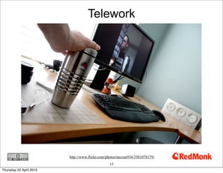A person's hand is holding a silver thermos with a red lid, positioned in front of a computer monitor displaying a man's face. The scene is set on a wooden desk with various items including a keyboard, a mouse, a cup, a pair of glasses, a pen, and a small figurine. There is a wall-mounted clock and a power strip on the wall behind the desk. | Telework\n\n\n\n\n http://www.flickr.com/photos/mccun934/3501078179/\n ... | 5fbdfaa6f0e9e4325aa50236485b46469c2b1b0e43fb8aa5021f997550185473 | 000720962952 | 0 | 0 | 66 | 3 | 0 | 0 | |
