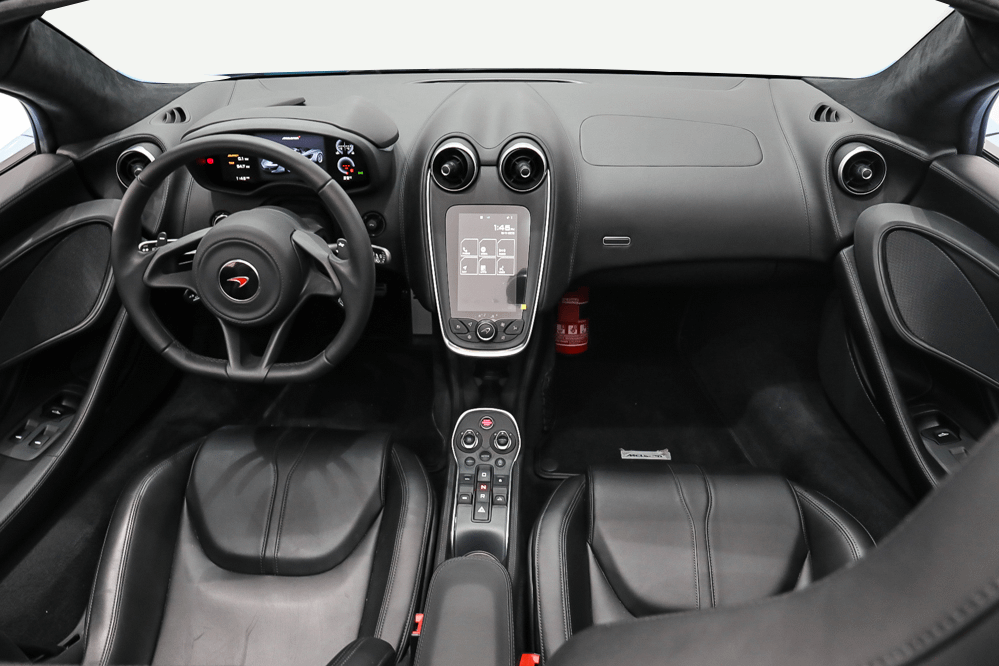 The interior of a car with a focus on the driver's side. The dashboard features a modern design with a digital display showing the time and other information. The steering wheel is black with a red logo on the side. The center console has a gear shift lever and a cup holder with a red cup inside. The seats are black with a gray trim, and the floor is covered with a black carpet. The car appears to be a luxury model with a premium interior. | Cars for Sale_McLaren_Al Awir | 0674bcb73de41184bb65eb785776f6919843054c645ea4098cb1088ef46b544f | 000720962930 | 0 | 0 | 86 | 4 | 0 | 0 | |