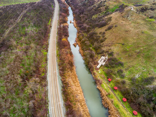 Aerial view of a winding river surrounded by hills and trees, with a highway running parallel to the river. The river is flanked by dry, brown vegetation, and there are red structures visible on the riverbank. | Drone shot over Markeli was a medieval Byzantine and Bulgarian frontier stronghold, the ruins of which are located in Karnobat Municipality, Bulgaria, Europe | 791b57861a3beaa274308b2acc6a6b5de7b53dbe6bb005ebb2a4b2342a32d584 | 000720930310 | 0 | 0 | 36 | 23 | 0 | 0 | |