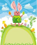 A cartoon character of a rabbit with large ears and a green leaf-patterned vest is standing on a grassy hill. The rabbit is holding a yellow egg in its left hand and a green egg in its right hand. There are various eggs and a yellow flower scattered around the hill. The background features a blue sky with clouds and a few birds flying. | Easter card with Easter bunny Royalty Free Stock Photo | de1f3014e2951cf2d65cd01d92790c09d05680e71cc26d4a0dd2383eb9ab1d2e | 000720930370 | 0 | 0 | 64 | 9 | 0 | 0 | |