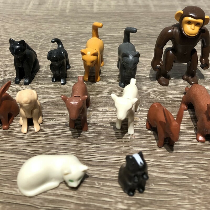 A collection of various animal figurines is arranged on a wooden surface. The animals include a white cat, a black cat, a yellow cat, a brown dog, a white dog, a black dog, a brown monkey, and a white monkey. The figurines are positioned in a way that creates a sense of movement and interaction among the animals. | Playmobil Animal Figure, Multi, Size: 13pcs | 0b8aef9b81f7dedfea5ece65b2ea597bc26ec8ad53f402624b828a8d4c37f0d0 | 000720964950 | 0 | 0 | 58 | 6 | 0 | 0 | |
