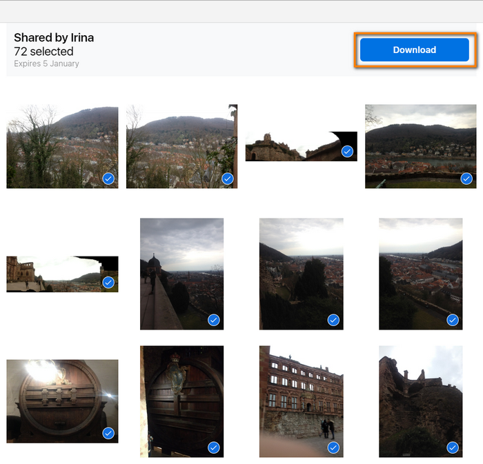 A digital image of a cityscape with multiple photos arranged in a grid. Each photo is overlaid with a blue square and a number, indicating that they are selected. The top left corner shows a download button with an orange arrow and the text 'Download selected (77)'. The image is captioned 'Shared by Irina'. | How to download photos from iCloud: 3 ways you haven't tried yet | 6de10a2d69a23481dd26339de893d1fb3d64d81552d4f61c9bb948daf1fb8638 | 000720965028 | 0 | 0 | 54 | 12 | 0 | 0 | |