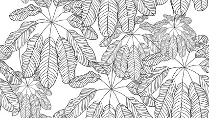 A black and white illustration of a dense jungle scene with various shades of gray leaves and branches. The leaves are detailed with intricate vein patterns, and the branches are depicted with varying thicknesses and textures. The overall image has a monochromatic tone, with no color present. | Foliage seamless pattern, leaves line art ink drawing in black and white | b1c4fa58b6a3cde4be92e373eee7e11b74e25eb994339bc02264758bec0f8948 | 000720930548 | 0 | 0 | 47 | 12 | 0 | 0 | |
