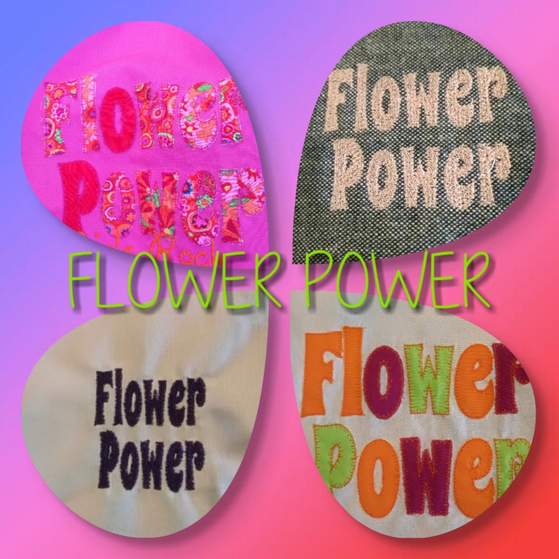 The image displays four fabric patches with floral designs, each with a different color scheme. The top left patch has a pink background with a floral pattern and the word 'FLOWER' in blue embroidery. The top right patch has a green background with a floral pattern and the word 'POWER' in blue embroidery. The bottom left patch has a beige background with a floral pattern and the word 'FLOWER' in blue embroidery. The bottom right patch has a blue background with a floral pattern and the word 'POWER' in blue embroidery. | Flower Power text machine embroidery for you retro 60 fashion image 1 | 0332e459dcb5ec50a55a850d0973ebc18cfc3c864bac15aaecb35ae298f6ca6a | 000720930427 | 0 | 0 | 91 | 12 | 0 | 0 | |