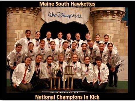A group of young female dancers in white uniforms and black shoes are posing for a photo. They are holding medals and are standing in front of a large trophy. The background features a castle-like structure with a banner that reads 'MAINE SOUTH HAWKETTES' and 'WALT DISNEY WORLD'. The dancers are arranged in two rows, with the front row kneeling and the back row standing. | The Hawkettes Won the National Championship in Kick in Orlando, FL | c4167b657033e18ad307b043ee267d9a138df9962ac9d6eb241467ca8af09daa | 000720930457 | 0 | 0 | 65 | 11 | 0 | 0 | |