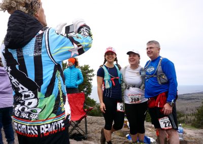A group of people is standing on a hill, smiling and posing for a photo. One person is taking the photo, capturing the moment. The group consists of three women and one man, all wearing running gear and numbers on their shirts, indicating they are participating in a race. The woman taking the photo is wearing a colorful jacket with a design that says 'Fearless Remotivate'. The background shows a clear sky and a scenic view of the landscape. | Party at the Top Continues - Photo Credit Amy Broadmore | 89d2cb9a6a98923983109f736c6ef2c4d81aea9b66846e9e191f073f1214c68b | 000720930559 | 0 | 0 | 79 | 10 | 0 | 0 | |