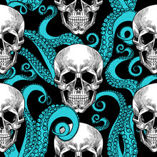 The second image is a modified version of the first, where the skulls and octopus tentacles are now in shades of blue and white. The background is a solid black color, and the overall image has a more monochromatic and stylized appearance compared to the first image. | Skull And Tentacles Of The Octopus .Vector Seamless Pattern | 3880a2f0d0c5364399815285120b3b0e53e964adc50af61cf7d63385e6553a6a | 000720965354 | 0 | 0 | 47 | 9 | 0 | 0 | |