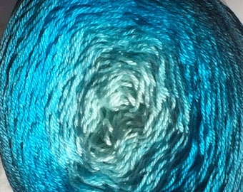 A close-up of a blue yarn ball with a textured surface, featuring a spiral pattern that creates a tunnel-like effect in the center. The yarn has a gradient of blue hues, with the lightest shade at the top and the darkest at the bottom. The background is out of focus, emphasizing the yarn's texture and color. | Cotton Gradient Shades of Turquoise | 346f0219ab334e822648296648b1cc9386557c9e4cd64abc7197a4b012dd7e5d | 000720965059 | 0 | 0 | 56 | 5 | 0 | 0 | |