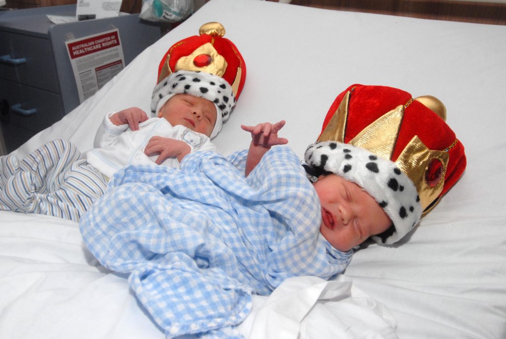 Two newborn babies are lying on a hospital bed, each wearing a royal crown. The baby on the left has a blue and white striped blanket, while the baby on the right has a blue blanket. Both babies have their hands raised, and the baby on the right is also wearing a red and gold crown. | Mackay Royal babies Daiquain Des Jai Langwe and Braxton Bernard Myles Stanborough. | 3c00747a39b0aa75d1a4bdb7c59f519b8cf7f526f0fe57673892a07eacaca5f9 | 000720965382 | 0 | 0 | 56 | 12 | 0 | 0 | |