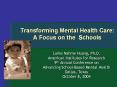 A flyer with a blue background featuring a child's face on the left side and text on the right side. The text reads 'TRANSFORMING MENTAL HEALTH CARE: A FOCUS ON THE SCHOOLS' and includes the name 'LUCIA HERRING, PH.D.' along with other details such as 'DEPARTMENT OF PSYCHOLOGY BY SPECIAL ARRANGEMENT WITH THE SCHOOL OF EDUCATION' and 'ANNUAL GARDEN OF HOPE CONFERENCE ON MENTAL HEALTH AND WELLNESS'. The date 'OCTOBER 2, 2010' is also visible. | Transforming Mental Health Care: A Focus on the Schools PowerPoint PPT Presentation | 85d9304380080a16c201f53ff1d5ba914f724189fe0e58f8e64cf636e1f322cd | 000720965346 | 0 | 0 | 75 | 12 | 0 | 0 | |