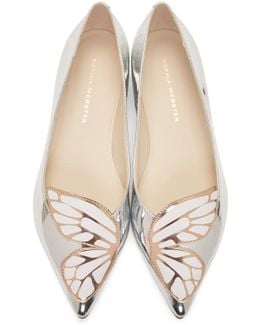 A pair of beige high-heeled shoes with a butterfly design on the toes is displayed against a white background. | Silver Metallic Bibi Butterfly Flats | 80ddbd049cccbc3783c351ea1a6c5104cb864037b3490fb25b5e2f5c6aaf1b22 | 000720965803 | 0 | 0 | 19 | 5 | 0 | 0 | |