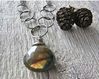 A close-up image of a silver necklace with a large, oval-shaped pendant featuring a multicolored, iridescent stone. The pendant is set in a silver bezel and hangs from a chain with multiple interconnected rings. To the right of the pendant, there is a small cluster of pine cones resting on the wooden surface. | 20% OFF Chunky Labradorite Pendant with Large Link Sterling Silver Chain, Statement Silver and Stone Necklace | 3e445c6262bef5eae66f95509224b20eef67739fbb100d4efd65f38f5ced3fd0 | 000720965712 | 0 | 0 | 53 | 16 | 0 | 0 | |