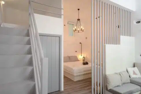 A modern bedroom with a white bed, a gray bench with pillows, a white floor lamp, and a chandelier hanging from the ceiling. The room has white walls, a gray door, and a white staircase leading up to a loft area. | Apartments for Sale Naxos Greece, Property in Cyclades | 80bd02dc80e5ee68fe9ec51a36cc722409ebd33ba195ed169166d9d97b29faae | 000720965722 | 0 | 0 | 41 | 8 | 0 | 0 | |