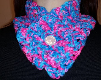 A close-up of a person's neck wearing a colorful crocheted scarf with a large, round, white button in the center. The scarf has a mix of blue, pink, and purple hues, and the person is wearing a black top. | Scarf with Button, Crochet | ccb74e9d9c15a531f0bdeaef0e1e2fc86e7274f8d8c59885e193c08d9bd0594e | 000720966299 | 0 | 0 | 39 | 4 | 0 | 0 | |