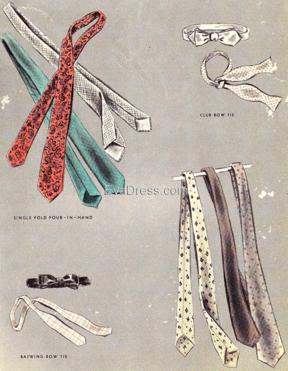 A collection of various neckties is displayed on a page with a vintage aesthetic. The ties are arranged in a way that showcases their patterns and colors. There are four ties in total, each with a unique design. The top left tie has a red and blue paisley pattern, the top right tie is white with a subtle texture, the b... | Rockabilly Men’s Clothing 1953 Set of Four Neck Ties EvaDress Pattern $10.00 AT vintagedancer.com | 7abe9eaedf481a3313c52bf79d79b940334c174b3578718016d1d54c9db06c82 | 000720966214 | 0 | 0 | 108 | 14 | 0 | 0 | |