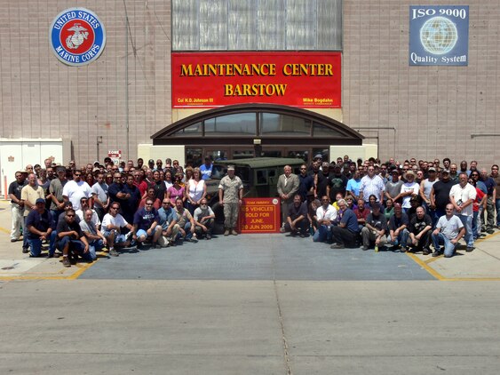 A group of people, including military personnel, are gathered outside a building with a sign that reads 'MAINTENANCE CENTER BARSTOW'. The building has a red and yellow color scheme, and there are two flags on the left side of the building. The group is standing in front of a large red and yellow sign with the number '3... | Maintenance Center Barstow, Marine Corps Logistics Base Barstow, Calif., Commanding Officer Col. Dale Johnson (left center), Deputy Commander Mike Bogdahn (right center) and Cost Work Center 717 Humvee Team workers stand next to the 105th High Mobility Multipurpose Wheeled Vehicle produced during June 2009. The workers... | 39bc36478611fe0488efb1c9e5075dd62ac67bf482bb7685c1e88947759013ac | 000720966035 | 0 | 0 | 74 | 67 | 0 | 0 | |