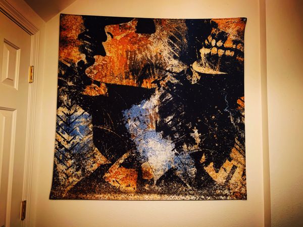 A textured abstract painting with a mix of warm and cool tones is hanging on a white wall. The painting features a variety of shapes and patterns, with a dominant blue hue in the center. The artwork is framed by a wooden door to the left and a white wall to the right. | CONVERGE - AXE TO FALL ALBUM ART BANNER (Rare) | dd5f686cb588af95fe5a12e1a70954847688de298a1e84d4ec8419ccf60c369d | 000720966152 | 0 | 0 | 53 | 9 | 0 | 0 | |