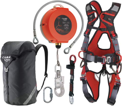 A collection of climbing gear is displayed against a white background. The gear includes a red climbing harness with a black and red design, a grey backpack with the word 'CAMP' on it, a red and black climbing helmet, a red and black climbing rope, a grey carabiner, and a grey climbing quickdraw. | Fall Arrest Kit Cobra Pro | 0e556d9cf320a08e583186c64af01b1d884054ecb479fc4d0a9037cd1c293e4b | 000720966379 | 0 | 0 | 53 | 5 | 0 | 0 | |