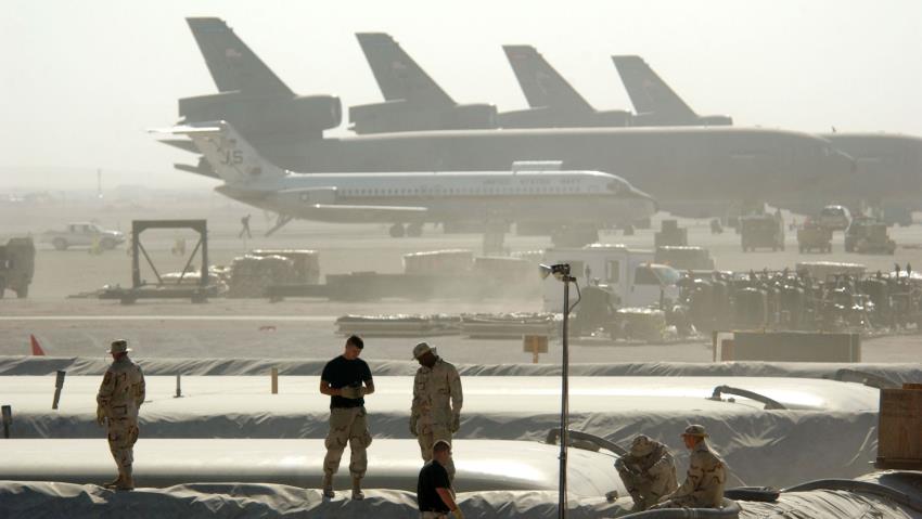 A group of soldiers in camouflage uniforms are standing in front of a large airplane on a dusty tarmac. The airplane has a military insignia on its tail and is surrounded by various vehicles and equipment. The soldiers appear to be in a military setting, possibly preparing for a mission or awaiting transportation. | Al Udeid is the largest US military base in the Middle East | 55ade3e074afadcaa13c12fd9fd8e4a6f33c528e8889e32baf9ac1115ecdb674 | 000720966413 | 0 | 0 | 53 | 12 | 0 | 0 | |