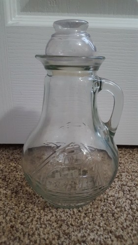 A clear glass pitcher with a smooth, rounded body and a curved handle sits on a textured beige carpet. The pitcher has a reflective surface that shows the surrounding environment, and it is positioned in front of a white door with a visible hinge and a door handle. | Antique Vintage Glass Syrup Pitcher with Plastic Stopper and Top Boat Embellish | 6a105b3abe28e4aad74f3e93b22bb07fbd137ac96d5f1560720821b27b661e9f | 000720966467 | 0 | 0 | 48 | 12 | 0 | 0 | |
