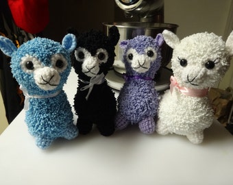 A group of four stuffed animals, each resembling a different animal, are arranged on a white surface. From left to right, there is a blue llama, a black llama, a purple llama, and a white llama. Each stuffed animal has a distinct color and pattern, and they all have cute, expressive faces with black eyes and white nose... | Amigurumi Llama Plush | 35f04501bd64687347e8872f7b7784ff32dc4d8b2c6a7dfb2eac756c9e39b888 | 000720966342 | 0 | 0 | 58 | 3 | 0 | 0 | |