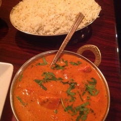A close-up view of a bowl filled with a red curry dish, garnished with cilantro leaves. The bowl is placed on a wooden surface, and in the background, there is a plate of white rice. The curry has a rich, orange color and is served with a metal spoon resting on the side of the bowl. | Photo taken at India Palace by Jassim on 10/21/2013 | d6fb9bd7962aa7b8802190ef75454e02516214e0817fb284b1780cd04550b266 | 000720966427 | 0 | 0 | 56 | 9 | 0 | 0 | |