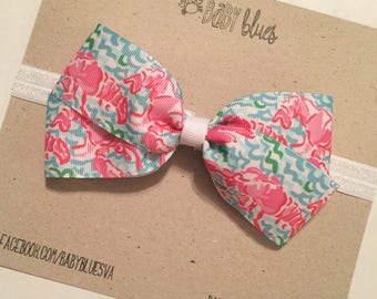 A pink and blue bow tie with a floral pattern is displayed on a beige background. The bow tie is tied in a bow shape with a white ribbon in the center. Below the bow tie, there is a white ribbon with a silver trim. The background has a textured appearance and is partially covered by a white card with the text 'Baby Blu... | Monogrammed hair bow. Lilly Pulitzer inspired bow headband. Monogrammed bow clip. Baby girl gift. Newborn girl gift. Lilly baby. Bow. | de94d43fb94bcd3828ff0c0600382449ab90e96f52ac651a0a3687c192d90fc4 | 000720966964 | 0 | 0 | 69 | 20 | 0 | 0 | |