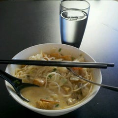 A bowl of noodles with vegetables and a glass of water are placed on a dining table. The bowl has chopsticks resting on the side, and there is a spoon inside the bowl. The table has a dark surface, and the scene appears to be set for a meal. | Photo taken at Chris Thai Cuisine by Ken H. on 8/16/2011 | de11eb8cbdbea17cf904249d75381cdeb2afd16731cb172344a22951fb3763e0 | 000720966914 | 0 | 0 | 49 | 11 | 0 | 0 | |