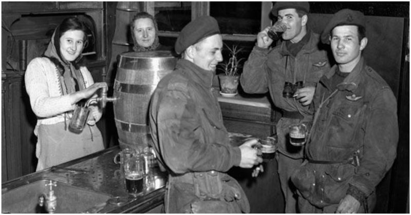 A black and white photograph depicts a group of people in a bar setting. There are four individuals in the scene, with two men standing on the right side and two women on the left. The men are wearing military uniforms, and the women are dressed in casual attire. One of the men is holding a glass of beer, and there are... | Personnel of the 1st Canadian Parachute Battalion having free beer at a local inn, Lembeck | bda0edb50901c822c5f0cf15c5bab6ea1698a20d7d3138d1eabd9e9e36187a10 | 000720966860 | 0 | 0 | 84 | 15 | 0 | 0 | |