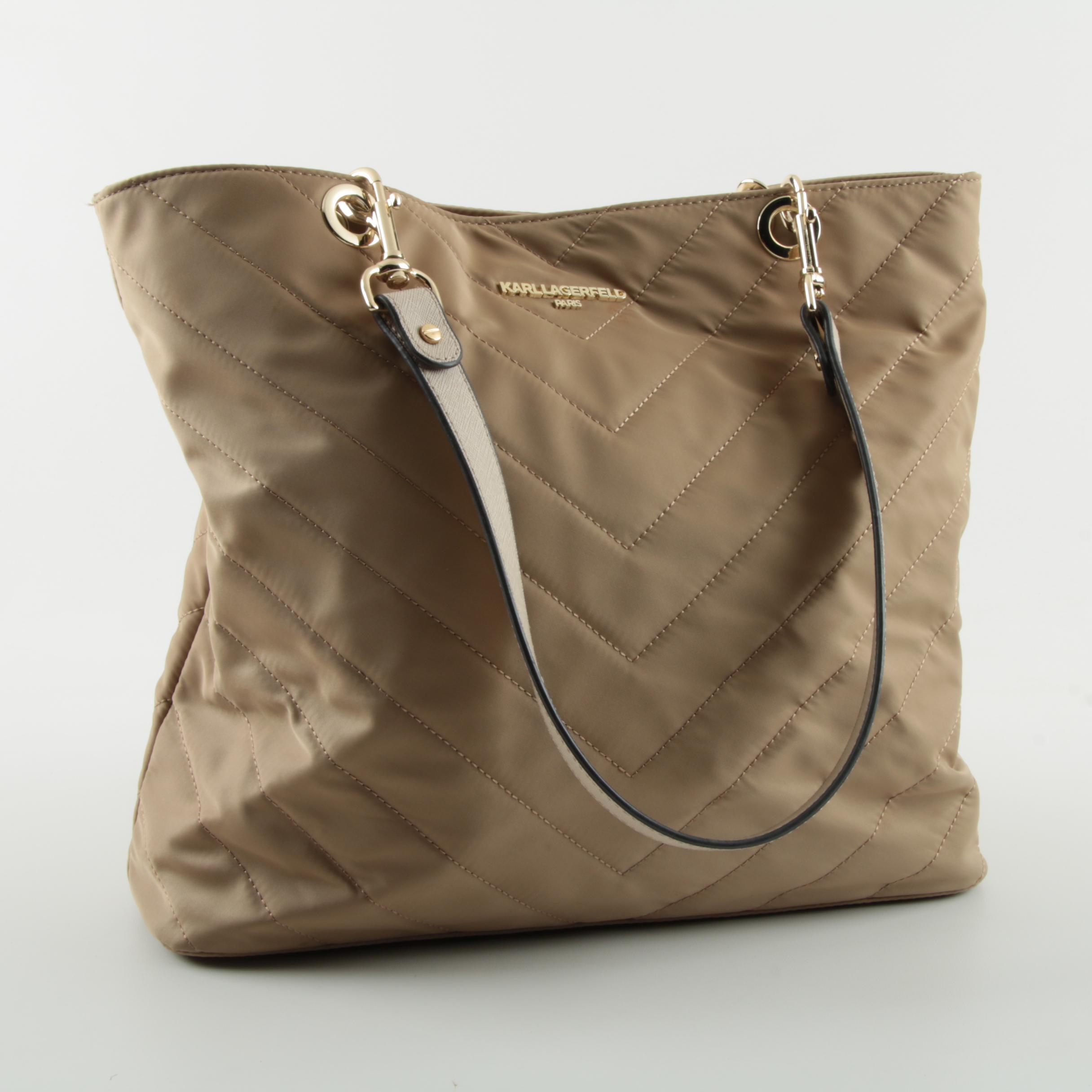 A beige handbag with a quilted pattern and a gold zipper is displayed against a white background. The bag has a long strap with a gold buckle and a small gold tag with the word 'Vivienne' on it. | Karl Lagerfeld Chevron Nylon Tote | 3cbc4fa9ad4c9cd5776f5220e701b9250fe0cb50be1c4030bcd202a7ed43ff47 | 000720967075 | 0 | 0 | 38 | 5 | 0 | 0 | |