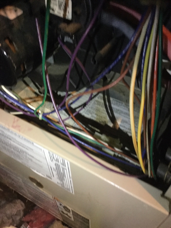 A close-up view of a disassembled air conditioning unit with various wires and components exposed. The unit is dirty and appears to be in a state of disrepair. There are multiple wires of different colors, including blue, purple, and orange, that are tangled and disconnected. The unit's casing is off, revealing a dusty... | Highland, IL - Trouble shooting a Lennox furnace | 77cff0015ca1518daa02b4a27f7ddd6841ef2539cfc6befe9f1069a002904dae | 000720967106 | 0 | 0 | 80 | 8 | 0 | 0 | |