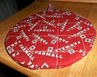 A red and white checkered cloth with the word 'FARMALL' embroidered in white on a red background is laid out on a wooden surface. The cloth has a pattern of white squares with red and white checkered corners. | Farmall Potholder, Potholders, Hot Pad, Hot Pads, Quilted, Handmade, Round, Trivet, Cotton Fabric, Insulated, 9 Inches | 6aa372f52beef76c1085c8926286446f51f57433de14a96aeb100353a984a070 | 000720967616 | 0 | 0 | 38 | 16 | 0 | 0 | |