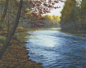 A serene river scene with a clear blue sky, the sun casting a warm glow on the water. The riverbanks are lined with trees, some with red leaves, and the water is calm with gentle ripples. The foreground shows a bed of fallen leaves, and the overall colors are vibrant and natural. | Autumn River by Bruce Dumas | 1c30e09fd2a63a0bb534d77a8c38f62f6d199ed867d192ba5a8206dd37bbb6e6 | 000720967589 | 0 | 0 | 52 | 5 | 0 | 0 | |