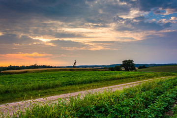 A rural landscape during sunset with a dirt road running through it. The sky is filled with clouds, and the sun is visible near the horizon, casting a warm glow. There is a solitary tree on the left side of the road, and the fields on either side are lush and green. | Sunset sky over dirt road and farm fields in rural York County, | 0c9437e11cc602dea398ecfce439cbc535dc6064f6e06f1d495798f58edeeb5d | 000720967560 | 0 | 0 | 52 | 12 | 0 | 0 | |