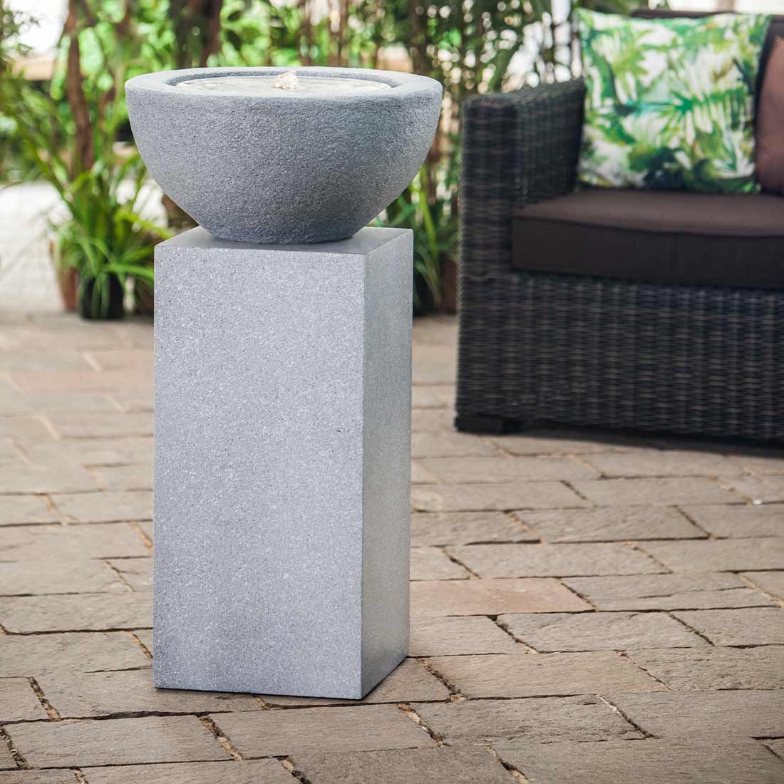 A modern, grey stone planter with a smooth surface and a simple, rectangular shape is placed on a patio. The planter is elevated on a short, square pedestal, and it contains a lit candle that casts a warm glow. The patio is adorned with a wicker chair and a cushion with a leaf pattern, and there are lush green plants i... | Heissner Half Ball LED Gartenbrunnen Polystone | 99b762e5bb8b89f925f3befbef8902d2a6889e18c8368f09a541467fd04b30cc | 000720967456 | 0 | 0 | 63 | 6 | 0 | 0 | |