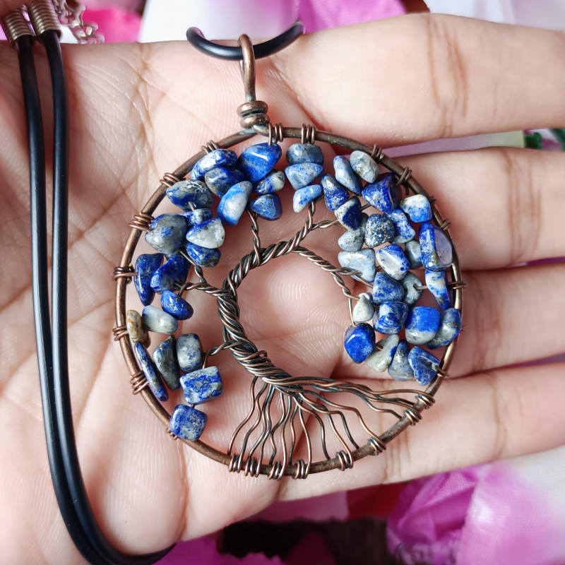 A person is holding a necklace with a circular pendant featuring a tree made of blue stones and copper wire. The pendant is surrounded by a halo of blue stones, and the necklace has a black strap. | Natural Beautiful Lapis Lazuli Tree Handmade Pendant Antique Design | 1cca9892847d63a4c9faf920557341b8c75cfe3133e54c971e5d0f2f1b7bb3e4 | 000720968277 | 0 | 0 | 37 | 9 | 0 | 0 | |