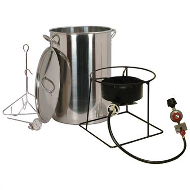 A stainless steel pot with a lid is placed on a metal stand, accompanied by a smaller pot and a metal rack with a kettle on top. The setup is on a white background. | King Kooker\xc2\xae 30 Qt. Outdoor Turkey Fryer Package | 05d739d83986d47a1c13ecaedb1308adaccc86a78942f5f84e2a0bd04613832a | 000720968193 | 0 | 0 | 34 | 8 | 0 | 0 | |