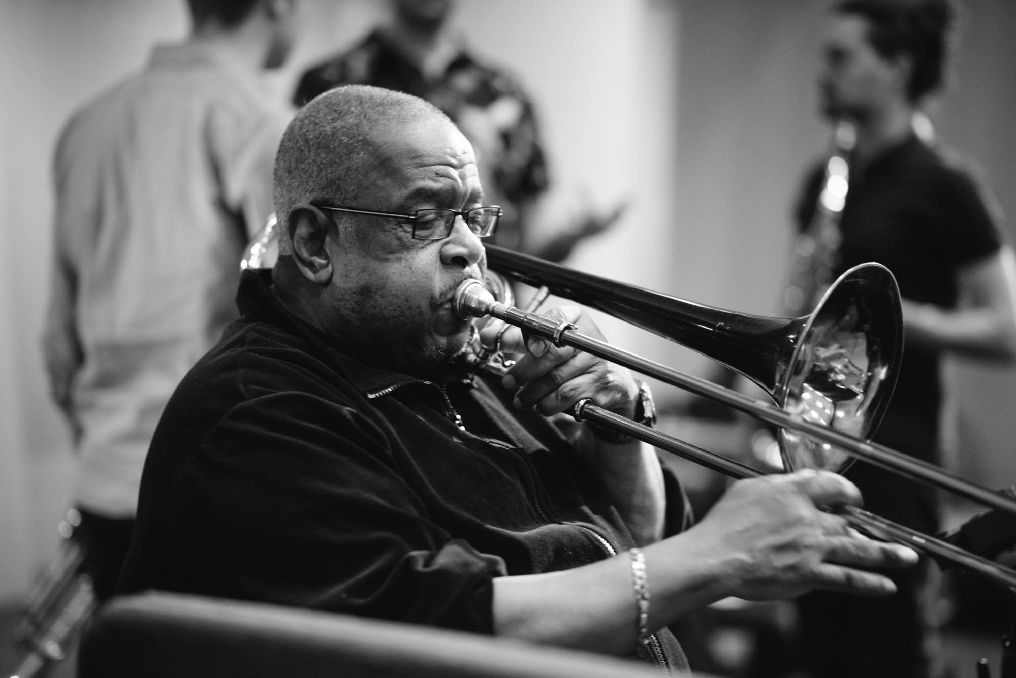 A man with glasses is playing a trombone. He is wearing a black shirt and has a bracelet on his left wrist. There are other people in the background, one of whom is playing a trumpet. | Fred Wesley performs in The Current studio | 082a66ecd947e000671267042d9ee2383559b045c0c04666e1bfcf9a9940c71f | 000720968203 | 0 | 0 | 36 | 7 | 0 | 0 | |