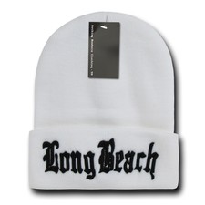 A white beanie with a black embroidered text 'Long Beach' on the front. The beanie has a black tag attached to the top left corner with a silver zipper pull. | Solid White Long Beach LBC Embroidery 12" Long Cuffed Vintage Beanie Beanies | c4348e14d7ef738a3c121c0e2afa24d85693e4514756ab985d3d7d4b394a470a | 000720968655 | 0 | 0 | 30 | 12 | 0 | 0 | |