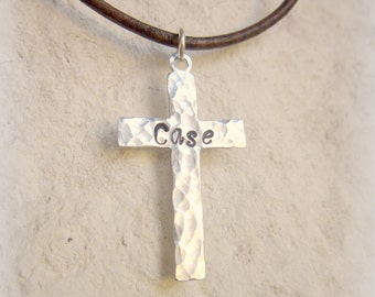 A silver cross with the word 'CASE' engraved on it is hanging from a brown leather cord. The cross is made of a textured metal that gives it a unique appearance. The background is a plain, light-colored wall. | Boys First Communion Gift.Boys Silver Hammered Cross Necklace. Mens Personalized Cross Necklace.Confirmation Necklace.Boys Communion Jewelry | e85f60abd75a6d316ceeb78e48d65ab6e94e1040782c15a962331bfc28b2baa0 | 000720968395 | 0 | 0 | 38 | 15 | 0 | 0 | |