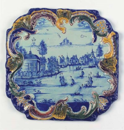 A blue and white porcelain plate with a decorative border and a central scene depicting a village with houses, boats, and people. The plate has a three-dimensional effect with raised elements and is set against a white background. | A Dutch Delft polychrome squar | 50dc801a26f6e54965452315cb51d584c1329b978bc4df1a1b2c68ebcd48a107 | 000720969006 | 0 | 0 | 38 | 5 | 0 | 0 | |