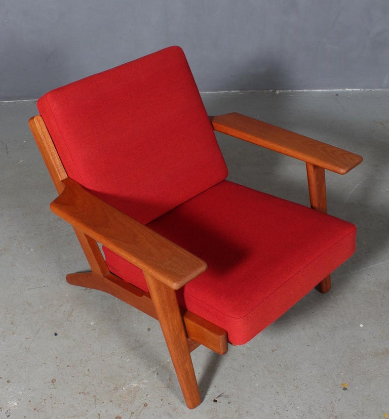 A red fabric upholstered wooden chair with a high backrest and armrests is placed on a concrete floor against a grey wall. | Hans J. Wegner lounge chair made of solid teak.\r\n\r\nOriginal Epeda cushions, original upholstered with Hallingdal wool from Kvadrat.\r\n\r\nModel 290, made by GETAMA.\r\n\r\n\xc2\xa0 | e58a7e7693c24c539972e718dc5eb1227f2d232bfa72c09f383de1c3911d97d9 | 000720969300 | 0 | 0 | 22 | 22 | 0 | 0 | |