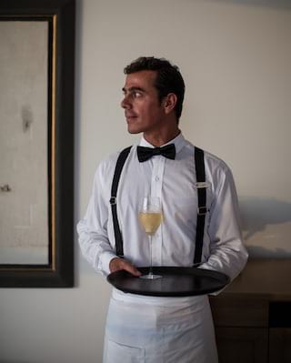 A man in a white shirt and black suspenders is holding a tray with a glass of white wine on it. He is standing in front of a wall with a framed picture on it. | Sommelier wearing a black bow-tie and white shirt, carrying a glass of white wine | ff28ddc6ab6c0a414c817ff2b97faf3b4bb11636db321582e006e3b1d400c36e | 000720969274 | 0 | 0 | 35 | 14 | 0 | 0 | |