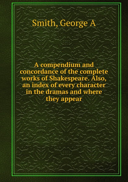 A book cover with a green background featuring a title 'SMITH, GEORGE A.' in a golden font at the top. Below the title, there is a quote in a smaller font that reads 'A COMPENDIUM AND CONCORDANCE OF THE COMPLETE WORKS OF SHAKESPEARE. ALSO, AN INDEX OF EVERY CHARACTER IN THE DRAMAS AND WHERE THEY APPEAR.' The cover has ... | George A. Smith A compendium and concordance of the complete works of Shakespeare. Also, an index of every character in the dramas and where they appear \xd0\xbe\xd1\x82\xd1\x81\xd1\x83\xd1\x82\xd1\x81\xd1\x82\xd0\xb2\xd1\x83\xd0\xb5\xd1\x82 a concordance to shakespeare | 374815fe84ea73b647184a73519a726420a75fb0180b692722057b29f7ba959e | 000720969198 | 0 | 0 | 69 | 31 | 0 | 0 | |